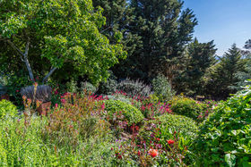 A fully enclosed dog run, also suitable for chickens, is positioned conveniently near the home.